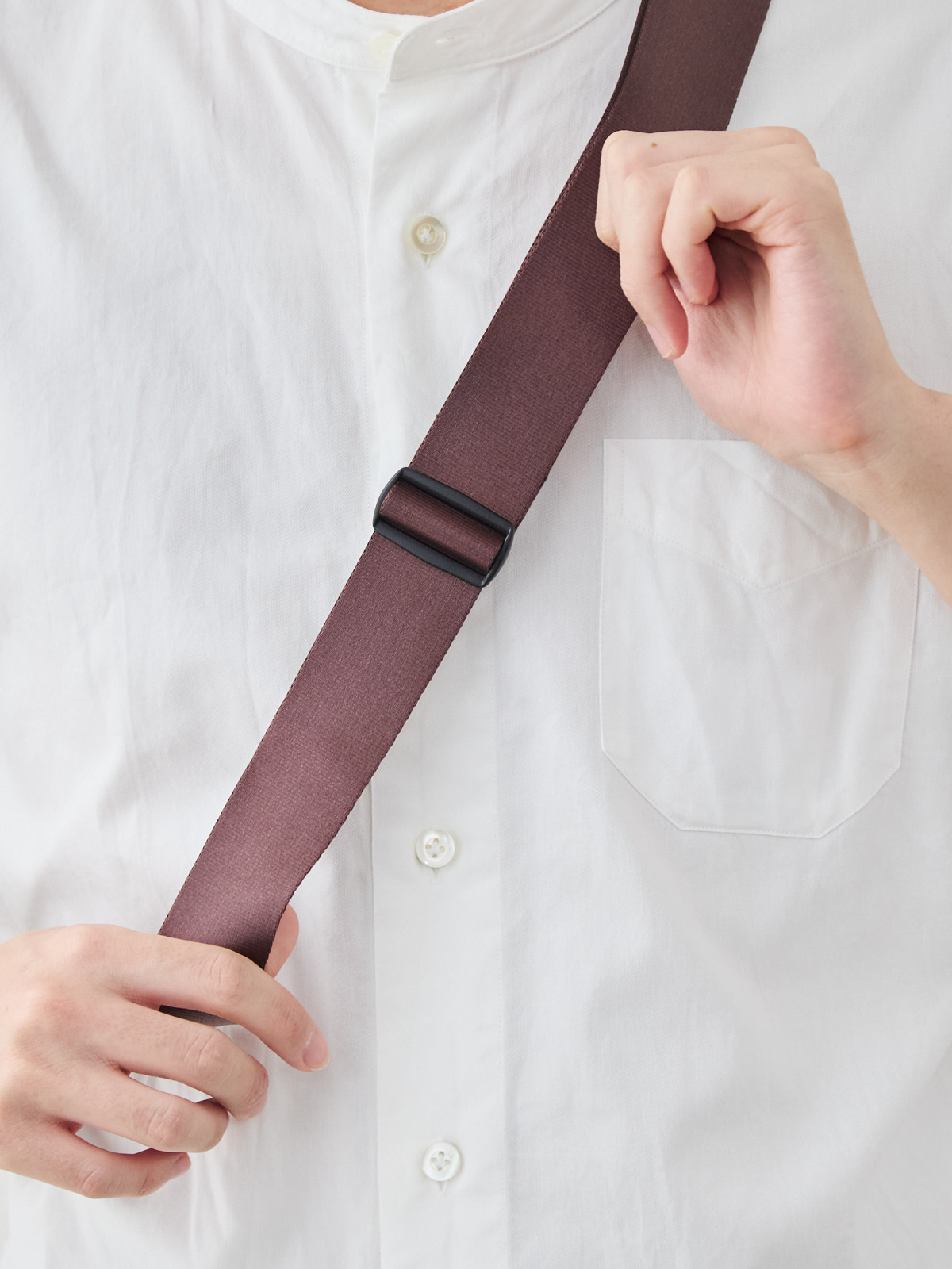 また、ベルト部分はナイロンテープ素材を採用。鞄専用の上質な素材で、程よい艶があり、バッグ全体の印象を引き締めています。付け根部分には抜け防止の補強縫製を施しており、重い荷物を入れても安心の強度を確保しています。耐荷重は最大5kgまで対応しています。